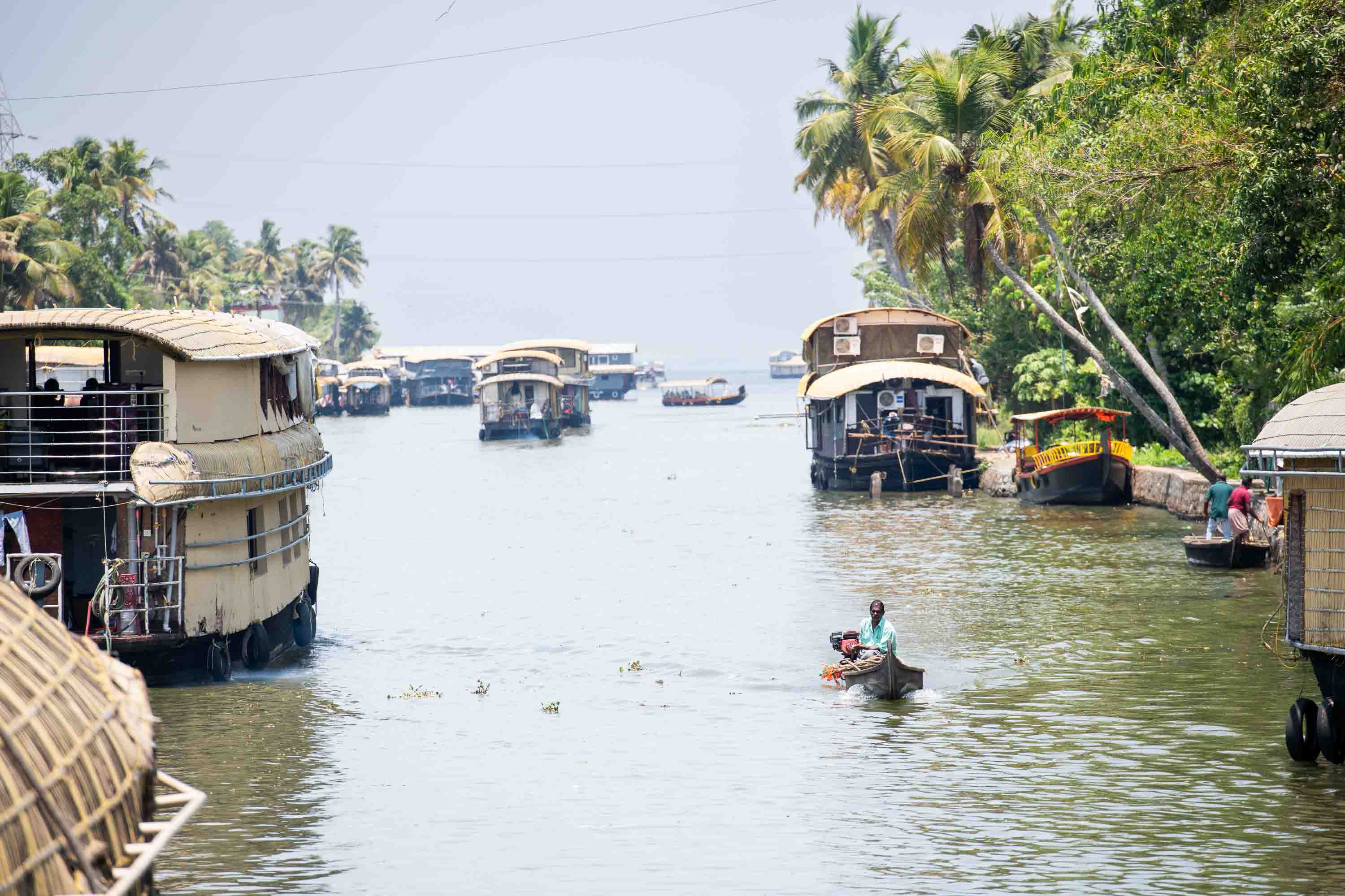 Dozens of houseboats snake up the canal, one after the other, and I feel certain a collision’s inevitable. I’m in the backwaters of Kerala, in southern India, cruising an intricate network of waterways that wind through palm-fringed rice fields and sleepy villages.
